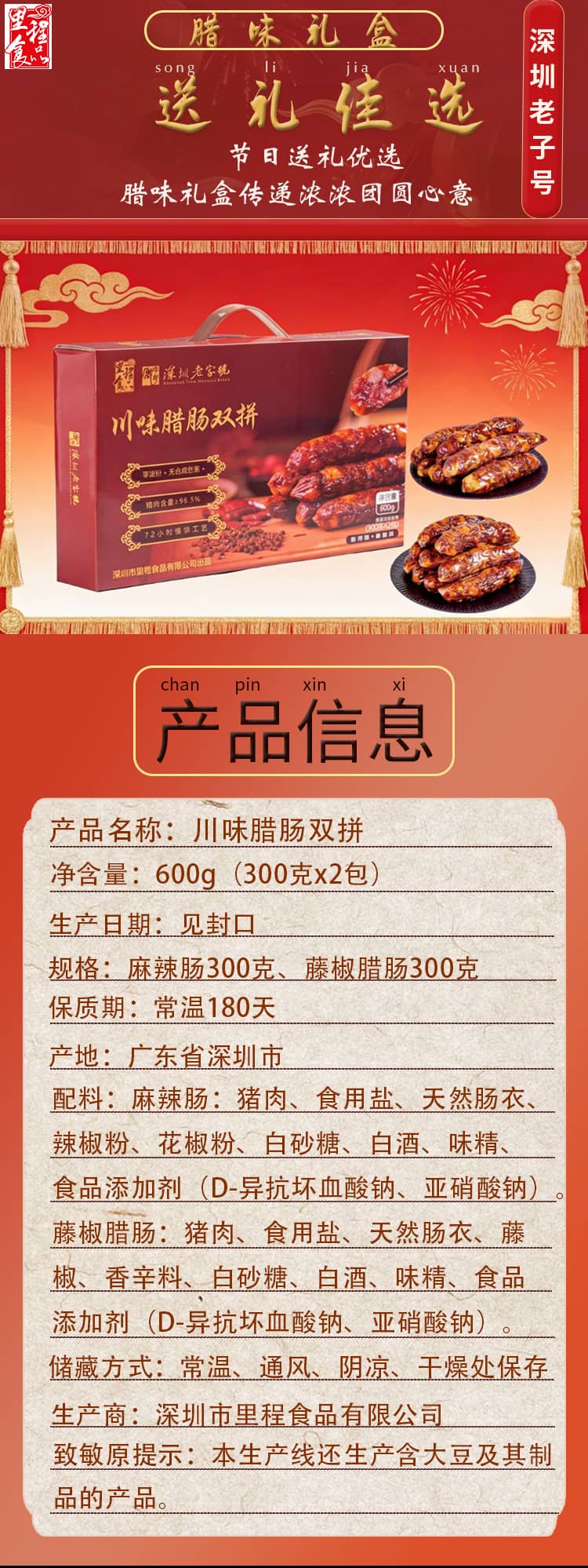 里程食品川味腊肠双拼礼盒装纯猪肉0色素送礼佳品
